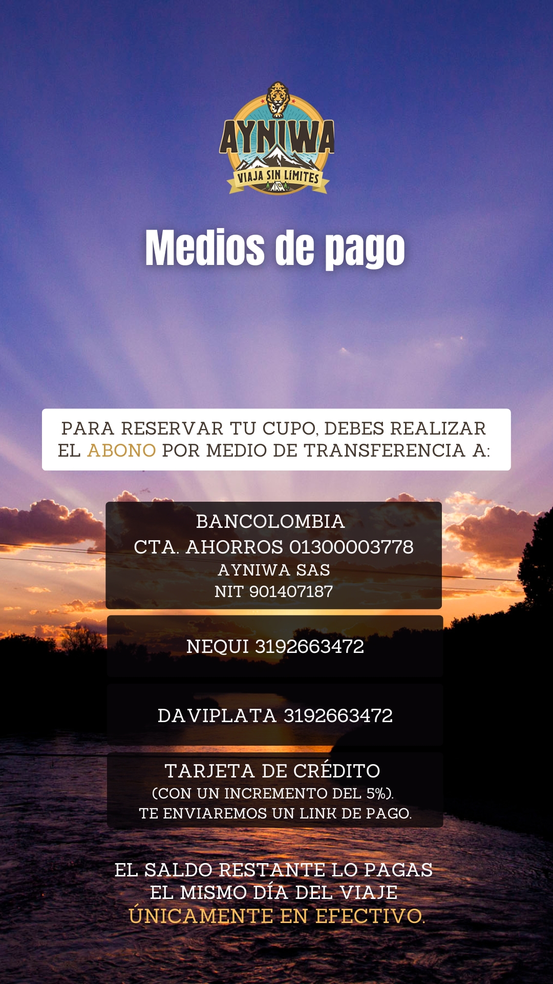 Si vas a viajar por primera vez con #AyniwaTravel te contamos que es muy fácil, conoce la Información Medios de Pago y sigue los pasos para el proceso de reservar tu cupo y realizar ecoturismo con nosotros.